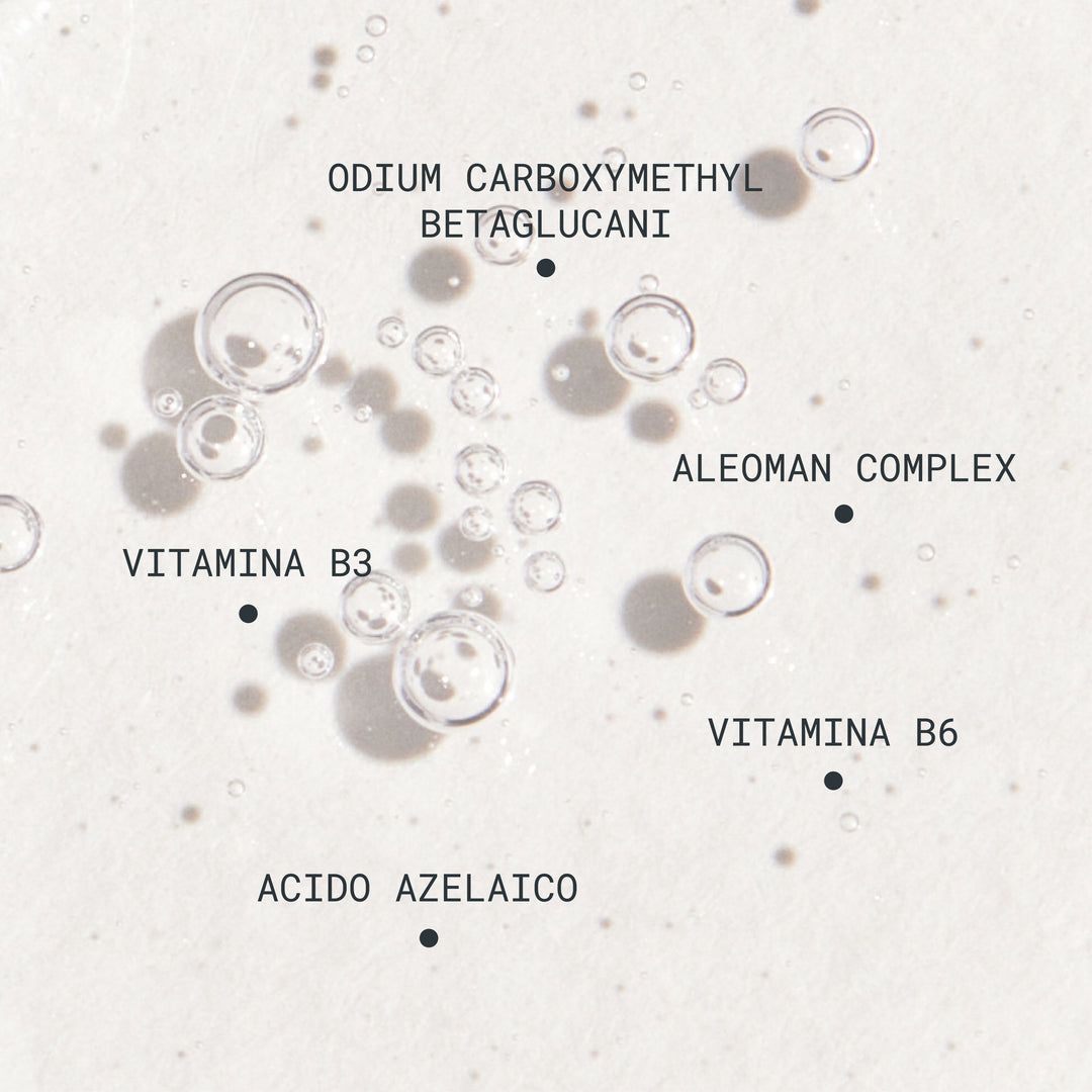 L’acido ialuronico, la vitamina B5 e l’acido mandelico idratano la pelle, regolarizzano la produzione di sebo e mantengono le caratteristiche del tessuto costanti nel tempo. Un complesso di Aloe e Manna (Alomann complex), molto idratante e ammorbidente, nutre la pelle donandole elasticità. Infine, le vitamine B3 e B6 e l’acido azelaico riattivano i tessuti per favorire la tonicità e addolcire le rughe profonde.